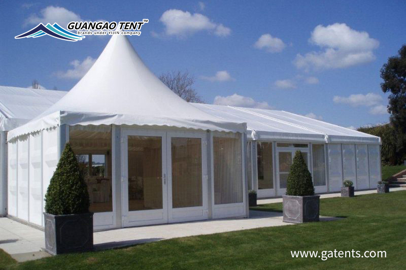 La luz máxima de la carpa combinada Guangao es de 65 metros y la lona seleccionada es de 850 g/metro cuadrado.La estructura interna de la carpa tiene un alto rendimiento de seguridad y es adecuada para bodas, celebraciones, reuniones, exposiciones, banquetes, etc. Tiene ventajas funcionales y apariencia única.
